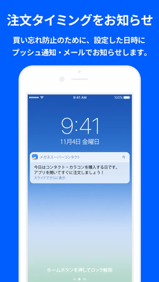 アラーム設定をすると、注文時期をプッシュ通知とメールでお知らせします。