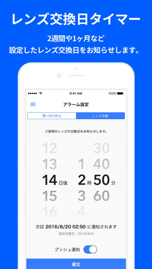 2週間交換レンズや1カ月交換レンズの交換時期をアラーム設定することで、プッシュ通知とメールで交換のお知らせします。