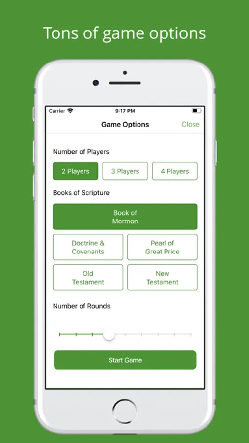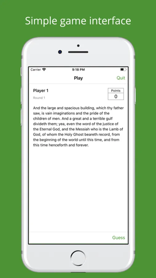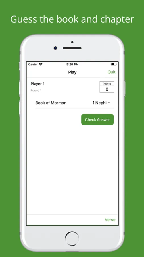 This app is intended as a fun way to learn and remember scriptures. Get some friends together, select the number of rounds you'd like to play, and start the game! You'll be presented with a scripture and must first guess the book it is in, and then the chapter it is in. Each wrong guess adds a point to your score. At the end of the game, the player with the least amount of points wins!