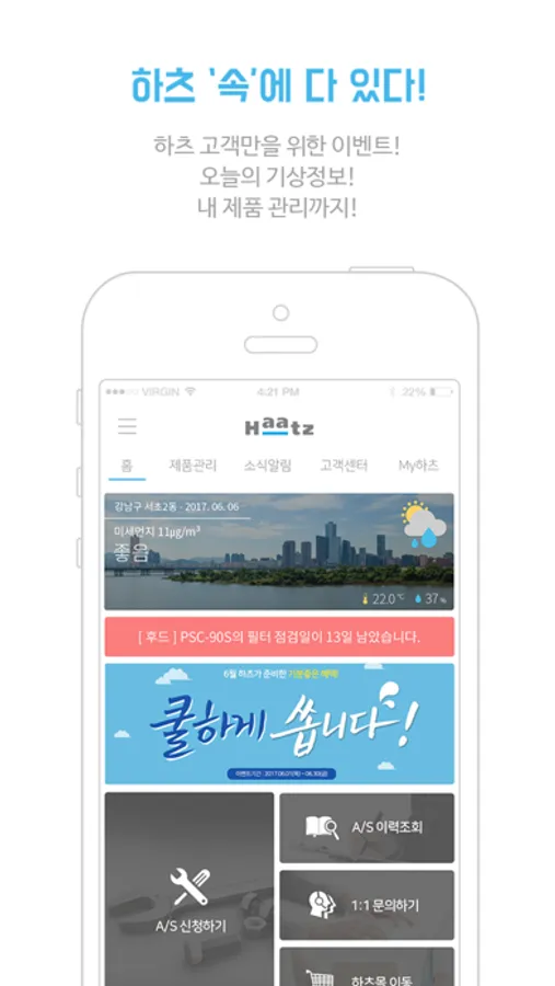 하츠 제품의 정기 점검 및 필터 교체 등의 제품 관리 서비스를 이용할 수 있으며, 동시에 제품의 A/S 신청까지 간편하게 이용할 수 있습니다.