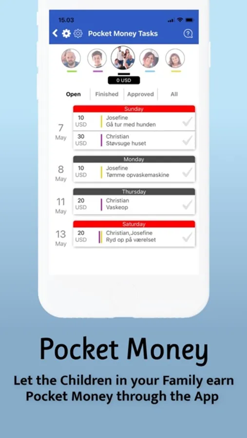 The App also includes functionality to support earning of and handling Pocket Money so the children in the family can earn pocket money by performing regular household duties in the family.