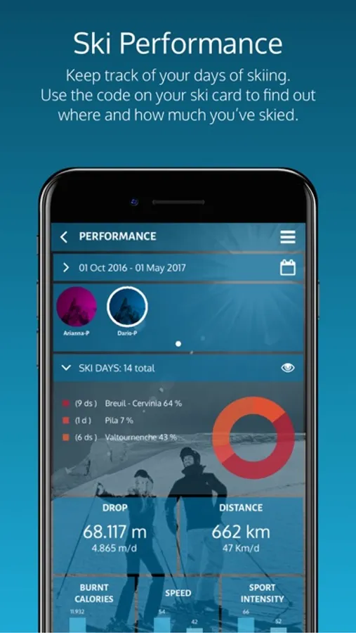 Ski performance – enter the code of your skicard and the skiing date and you can see where you have skied, the number and names of the lifts used, the total distance and altitude difference skied, calories burnt, average speed and sport intensity.