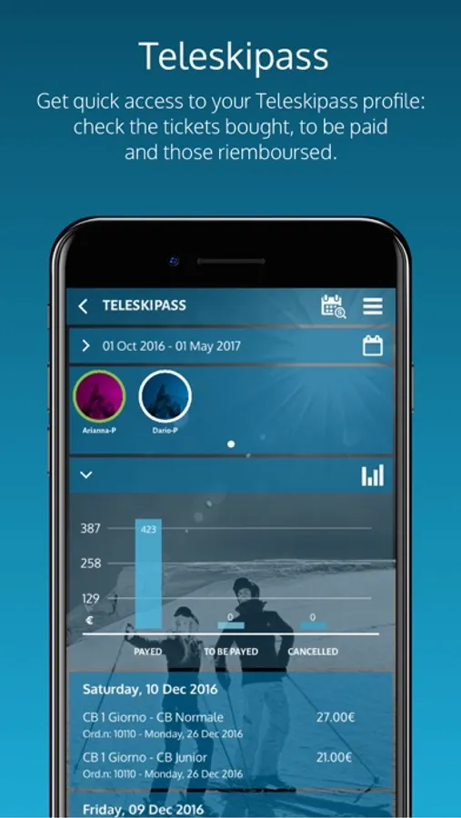 Teleskipass: check the situation of your teleskipass contract, the tickets bought, to be paid for or reimbursed. Create and manage your own ski team.