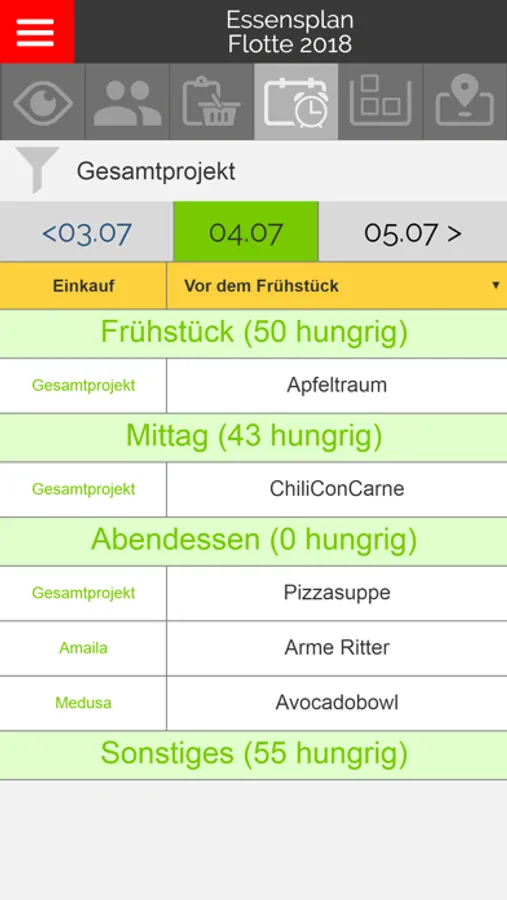 Im Essensplan kannst du, für die nächsten Tage oder aber auch für die ganze kommende Woche planen, was es zu essen geben soll. In der obersten Zeile des Essensplan wird angegeben wann eingekauft werden soll und schon kann die Freizeit losgehen.