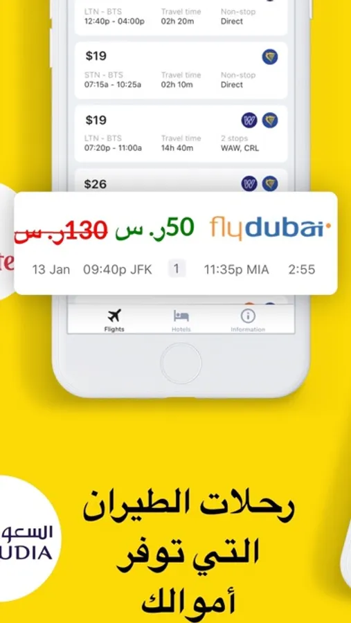 حجز أرخص رحلات الطيران لم يكن بهذة السهولة من قبل! سيقوم تطبيق رحلات الخصم بالمقارنة بين أسعار تذاكر الطيران من مئات شركات الطيران ووكالات السفر، وسيقوم بتوصيل عروض مثالية إلى جهازك مباشرةً.