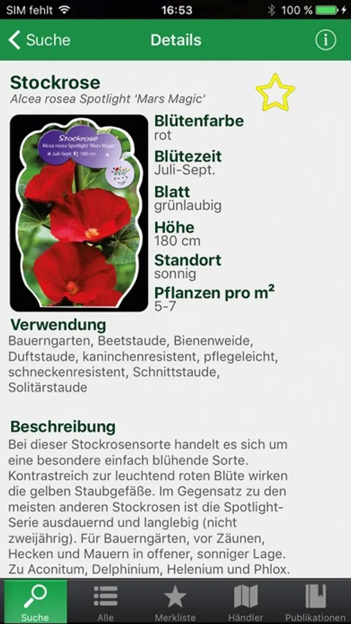 Lassen Sie sich zu den über 1400 Arten und Sorten Bilder und umfangreiche Informationen anzeigen. Die App beinhaltet zu jeder Sorte ein Bild, eine ausformulierte Sortenbeschreibung und weitere Informationen wie z.B. Blütenfarbe, Blütezeit, Wuchshöhe und empfohlene Lichtverhältnisse.