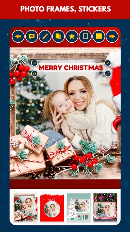 Whether you have something specific in mind or don’t know where to start, our app does everything right. Download now and start to design your own Christmas frames. Add your photo, text or paint to our frames and make the coolest Christmas composition for everyone. Moreover, set the Christmas pic that you created yourself as the wallpaper on your device. Share those cool pics with all your friends and family! Edit your pictures with a personalized Christmas 2021 and New Year’s Eve 2022 photo frame.