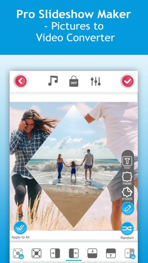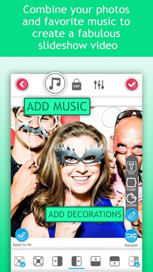 If you would like to make an amazing and thrilling slideshow out of your dearest photographs, now is the right time to do so! Download our awesome app and fit all your precious photos into a long video made of happiness and entertainment! Now you can create a video out of your pics and add your favorite background music, beautiful frames, great stickers awesome photo transitions to it! And that's not all! Write a text over your newly – made video and stand out of the crowd by creating a little piece of art that you will remember forever! Save your work and show it to your friends via some popular social networks such as Facebook, Twitter or WhatsApp! Live your most beautiful memories via the best slideshow maker and grow into an inspiring artist!