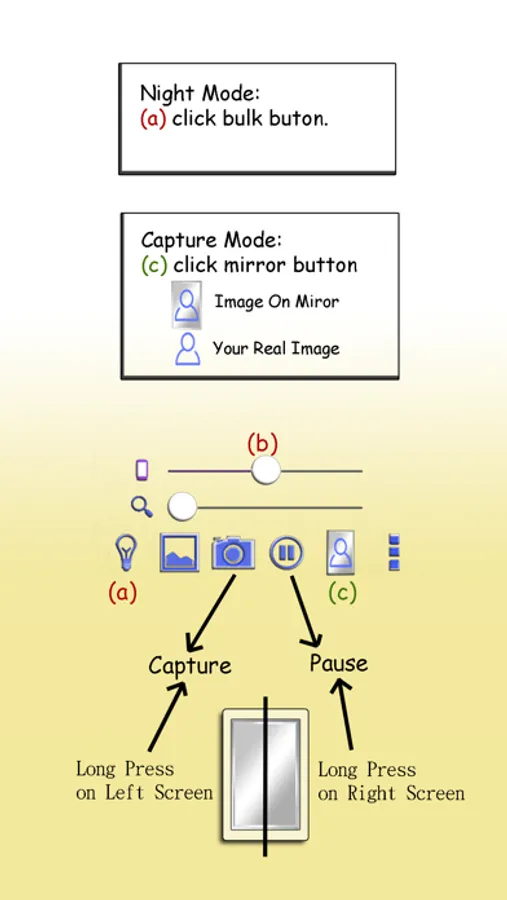 8. Long press on left screen could camera capture. Long press on right screen could pause preview. (Good for use when full screen preview)