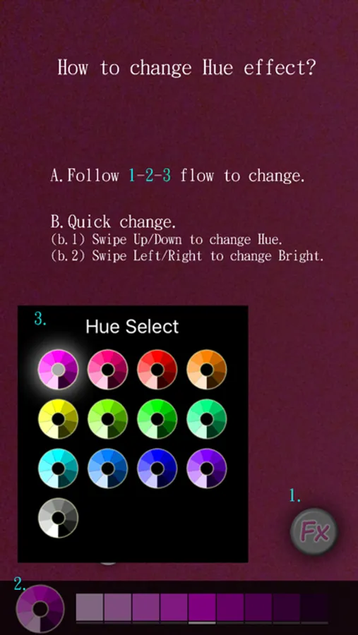 7. Press the Fx button to enable hue effect. After enabled, you can swipe Up/Down to change hue or swipe Left/Down to change brightness.