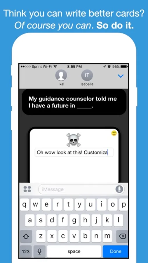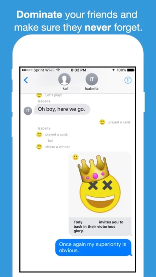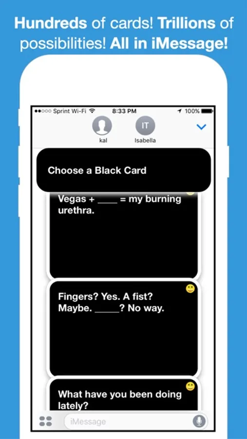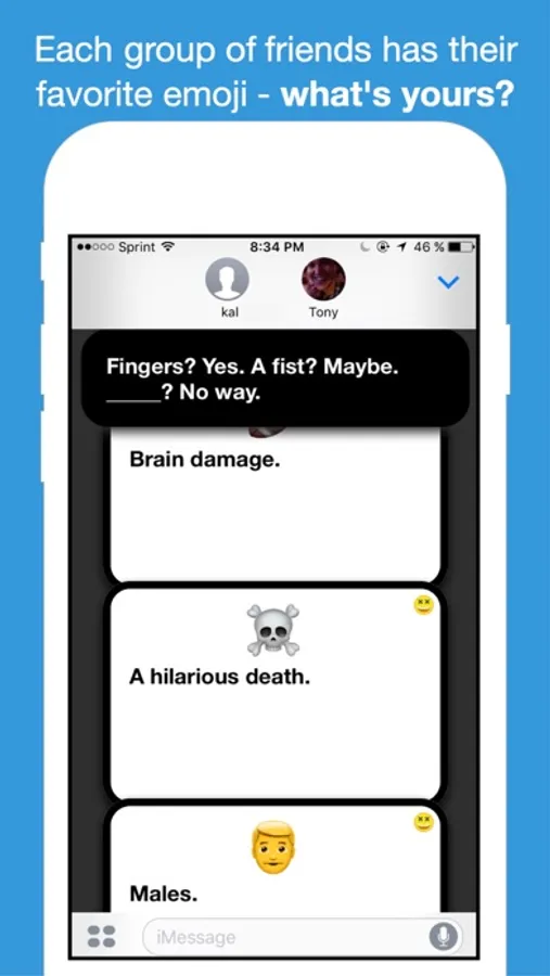 • Send that black card to 2+ friends in iMessage (This version of Emoji Against Humanity does not support you playing with yourself)