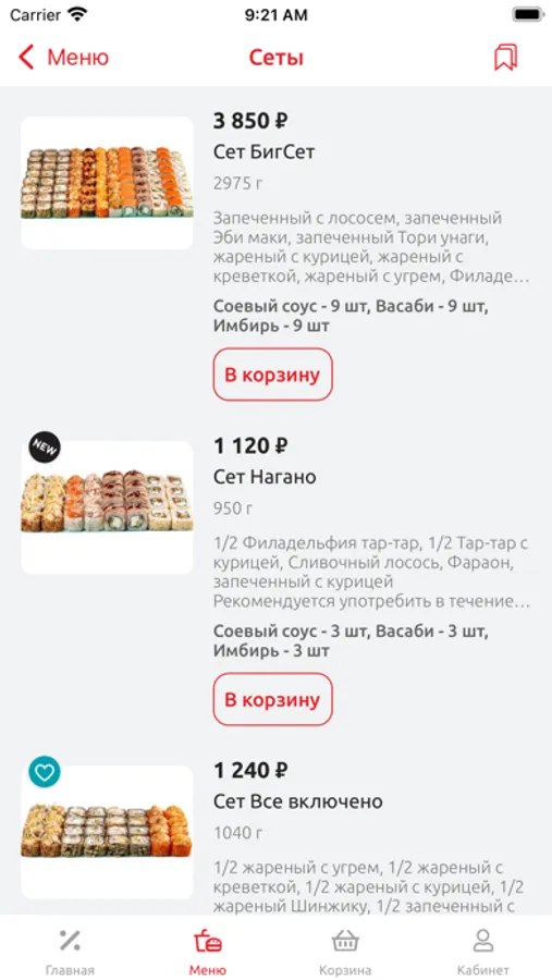 Чтобы заказать суши и другие кушанья, зайдите в соответствующий раздел нашего меню. Каждый товар сопровождается фотографией, указанием состава ингредиентов, веса порции и стоимости. Кликните по плашке «Добавить в корзину» возле понравившихся суши. Скорректируйте количество порций и введите контактные данные. Наш менеджер свяжется с вами для подтверждения покупки.