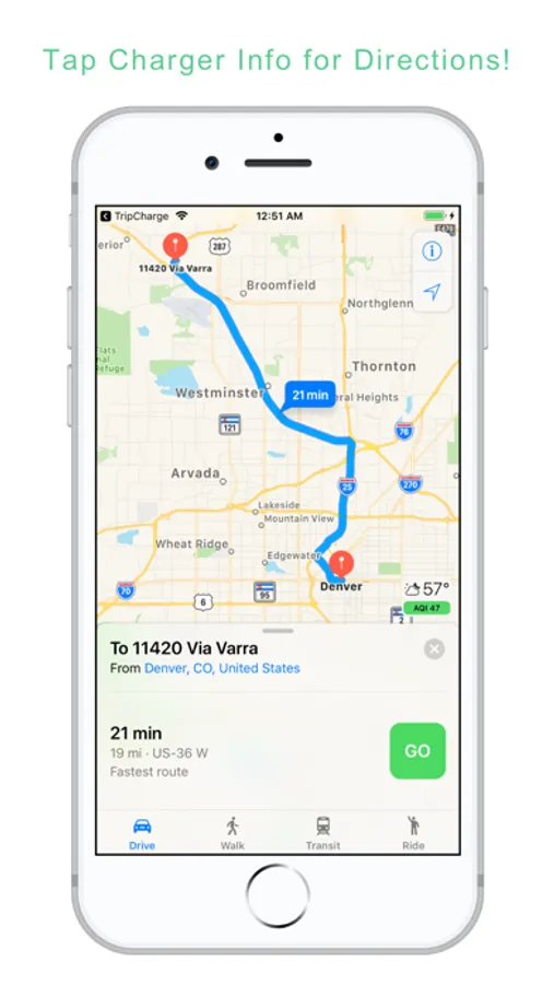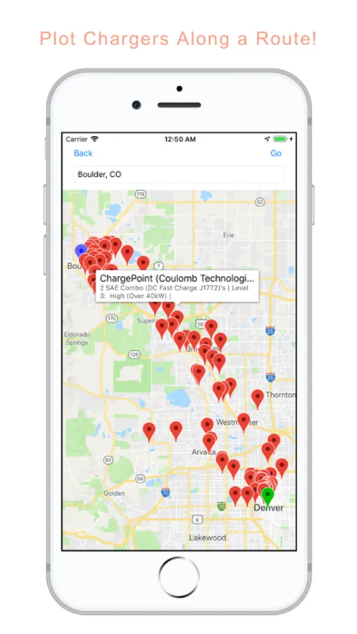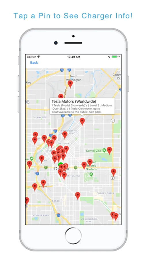 Tap the pins' info window to navigate to the charger via Google Maps or Apple Maps.