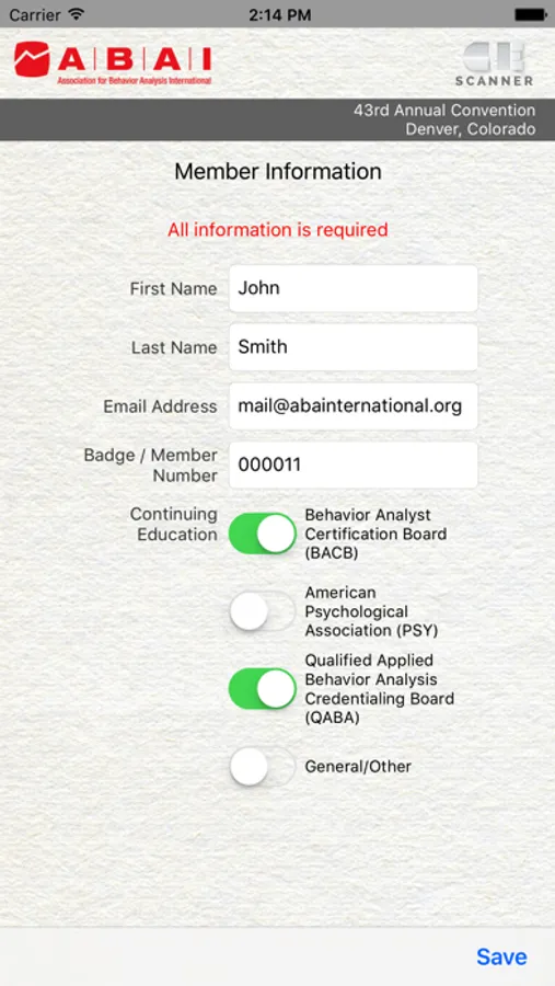 New for 2017! ABAI is pleased to release the CE Scanner, which allows you to scan in and out of CE sessions using your smartphone. Quickly fill out your user profile and select which types of CE you wish to earn (not all sessions are approved for all CE types). Scan in and out of each session using the QR codes posted at the entrance and exit of each session. When connected to the internet, your scan history will be synched with the ABAI database, meaning CE certificates will be available for download much sooner than in previous years. A record of your scan history will also be saved in the app, for your reference. Happy scanning!