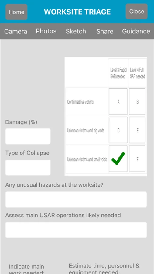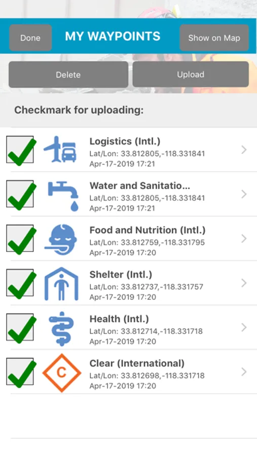 Disaster Surveyor is designed by and for international and domestic first responders for collecting information to help coordinate search and rescue operations. Using standard United Nations INSARAG forms, ability to attach photos, upload forms to a web-based manager, generate search markings, mark waypoints with standardized icons + UNOCHA approved icons, create tracks that can be exported to KML and GPX for import into ArcviewGIS or other mapping systems, Disaster Surveyor provides a complete solution to your disaster management team coordination needs.