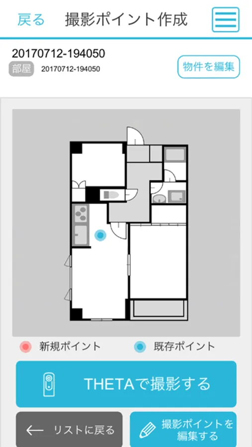 「撮影アプリ」を利用することで、間取り図上に撮影点の設置、VR画像の撮影、サーバへのアップロードを行うことが出来ます。