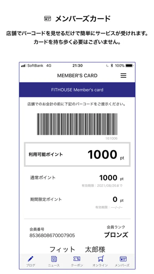 店舗・オンラインストアでご利用いただけるポイントシステムです。それぞれでポイントをためる事ができます。店舗でバーコードを見せるだけで簡単にサービスが受けれ、カードを持ち歩く必要はございません。