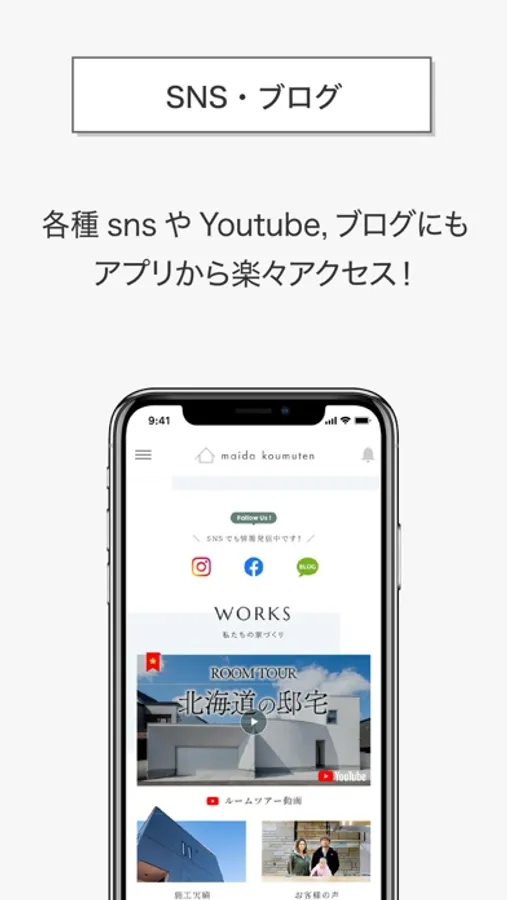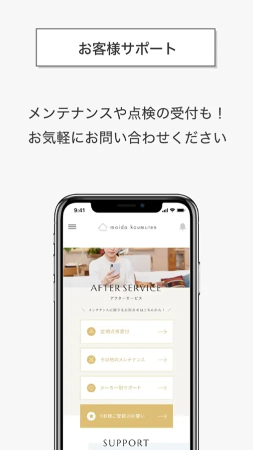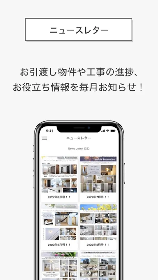 このアプリは、これから家づくりをはじめるお客様、マイダで家づくりをしていただいたお客様に、新着情報やお役立ち情報をお届けできるようにと開発しました。