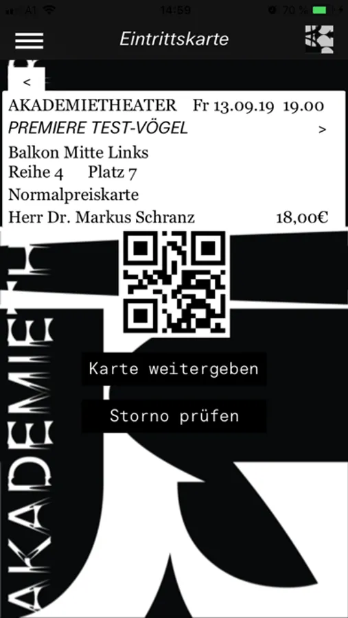 Die gekauften Karten werden in die App geladen - Sie zeigen bei Vorstellungsbesuch die Karten auf Ihrem Smartphone - und gehen ohne bei der Kassa anzustehen direkt zu Ihrem Platz.