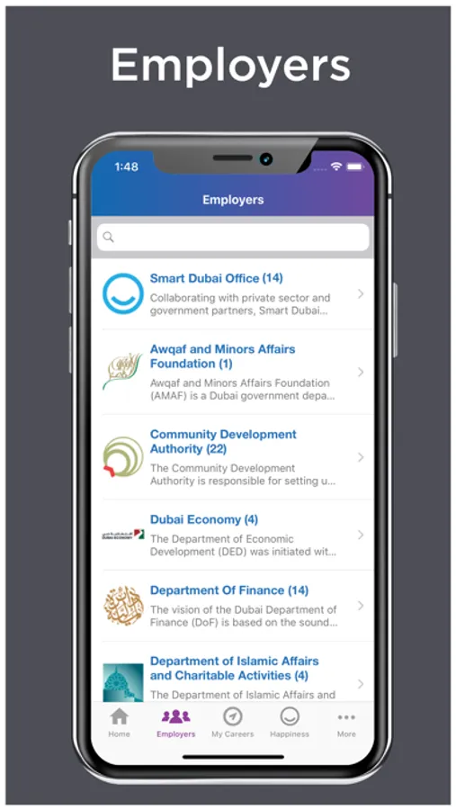 "Dubai Careers" / "وظائف دبي" is an innovative method developed by Smart Dubai Government Establishment, the technology arm of Smart Dubai, a city-wide initiative to transform Dubai into the world's smartest and happiest city in the world, for connecting job seekers of all categories anywhere with Dubai government entities.