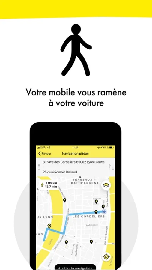 - GUIDAGE PIETON : votre application vous guide pour découvrir la ville (50 points d’intérêts) et revenir à votre parking