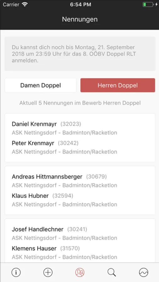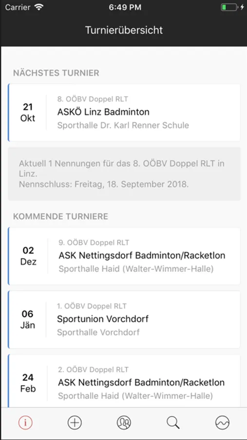 Mit der TA hast du alle OÖBV Doppel- und Einzel-RLT im Überblick. Du kannst in aktuelle Nennungen Einsicht nehmen und mit nur wenigen Klicks dich und einen Partner für das nächste OÖBV Doppel-RLT anmelden.