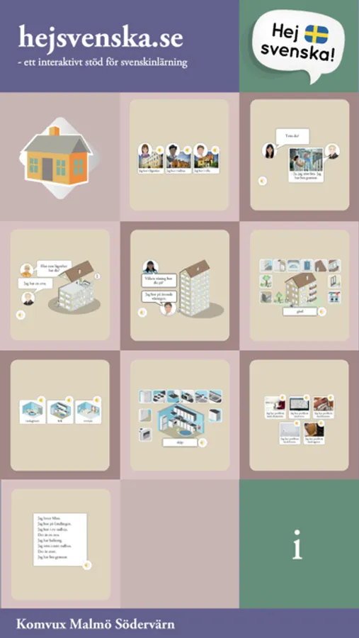 Träna snabbt och enkelt upp ett basordförråd i Hej Svenskas kapitel om bostad. Träna samtidigt upp en grundläggande läs- och skrivförmåga. Appen ger snabb återkoppling och det finns alltid möjlighet att se det rätta svaret via en hjälpfunktion.