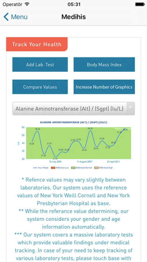 Medihis’ user friendly interface displays side by side comparison of medical tests and blood test chart which show the overtime changes in values and compares them with the reference ranges.