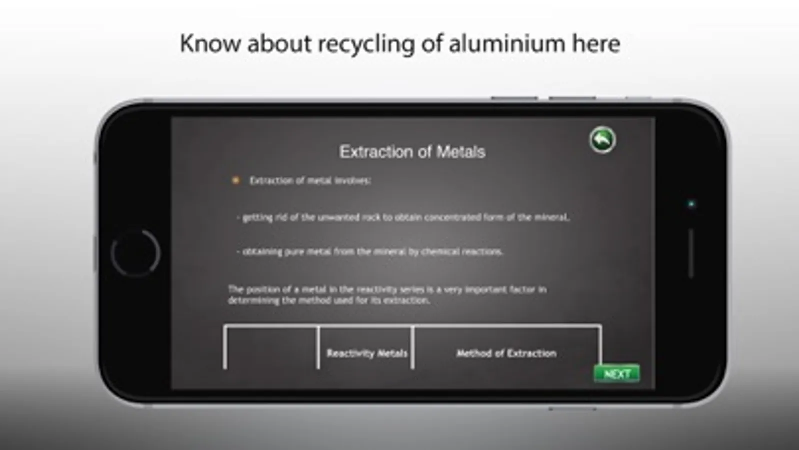 This educational application helps students understand and learn about the extraction of metals, solvent extraction, extraction chemistry, copper extraction, extraction of aluminium, ores, iron, recycling of metals in an easy and engrossing way.