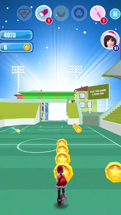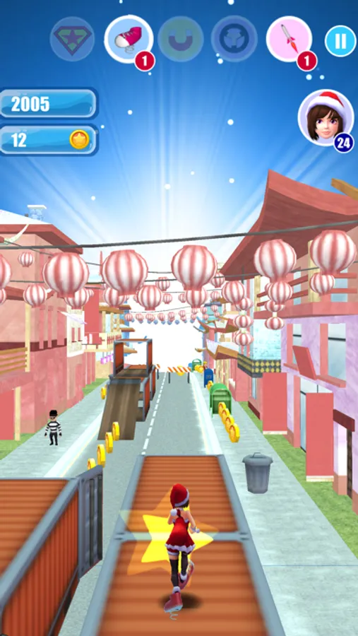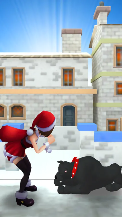Santa girl is helping out Santa Claus with his present deliveries but she has gotten into some trouble with an angry watch dog that is chasing her through the whole city. Your task will be, to not let her be caught from the nasty dog so that she can go back to her work.