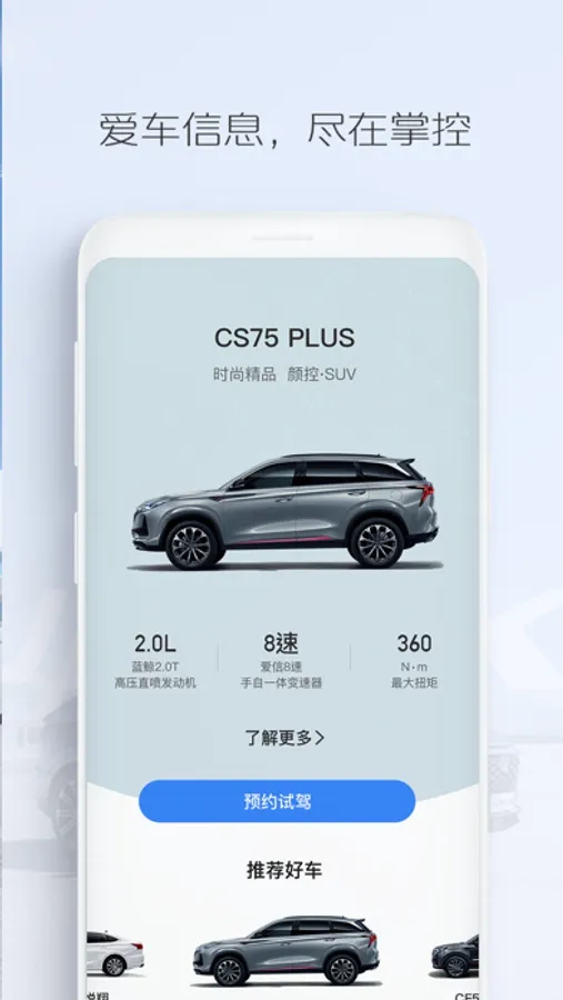 长安汽车APP,是以用户全生命周期全旅程服务为主,为长安车主和喜爱长安的用户打造的智慧服务生活平台。在这里,不仅为您提供用车养车服务,还可以随时随地分享生活,参与互动交流,内容共创,带给您不一样的乐趣体验,让生活更加丰富多彩。