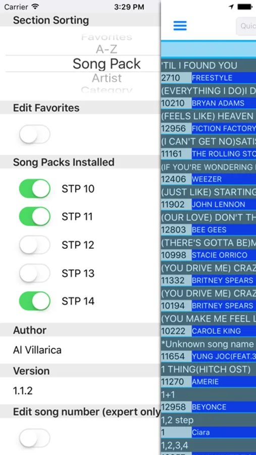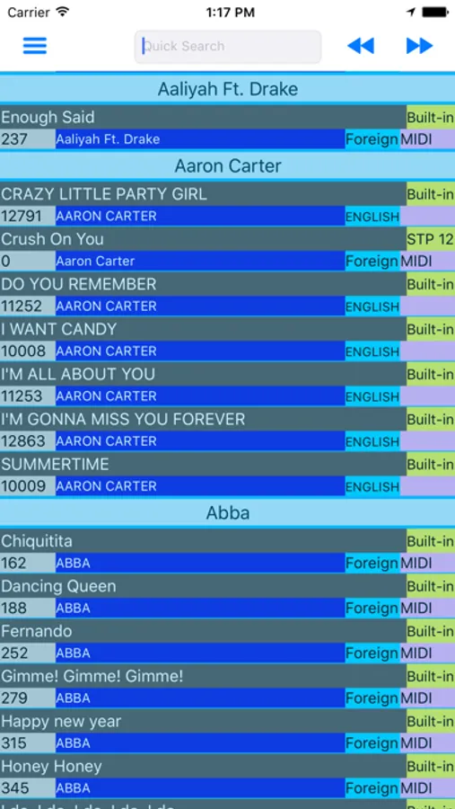 This is an app that makes it much easier to search for songs to enter into a Grand Videoke karaoke machine. The Grand Videoke only comes with a song list booklet, and searching for songs is at best, challenging. This app lets you group all the songs available on the Grand Videoke by Artist, song pack (e.g. built-in, Song Transfer Pack (STP) 9, STP 10, etc.), category, etc. You can even add songs to your favorites list so that you're always ready to sing the tunes you want.