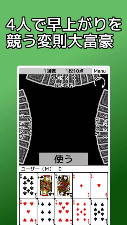 Play with 4 players using 54 cards, including 2 jokers. A hand of 10 cards is dealt and the goal is to get rid of them as soon as possible.