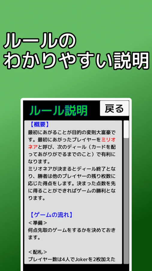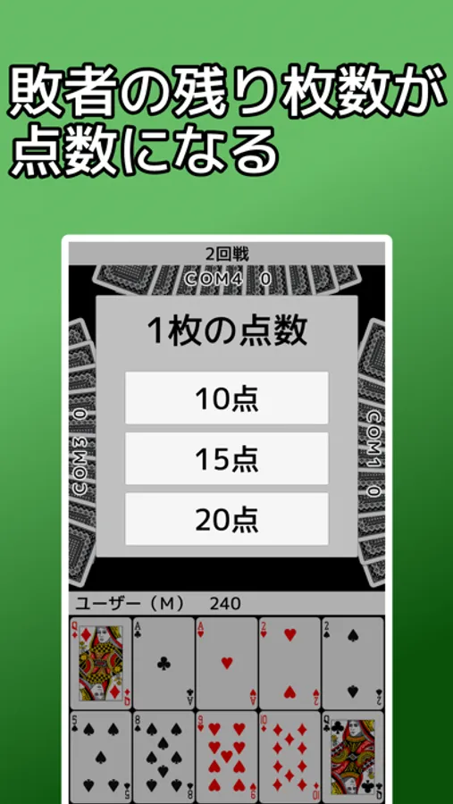 The basic rules are the same as the Millionaires, but the deal ends when the first player to appear. The winning player scores points according to the remaining number of other players. The game is won by scoring the set number of points the fastest.
