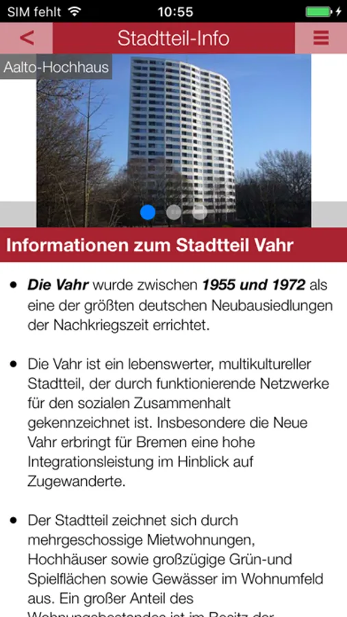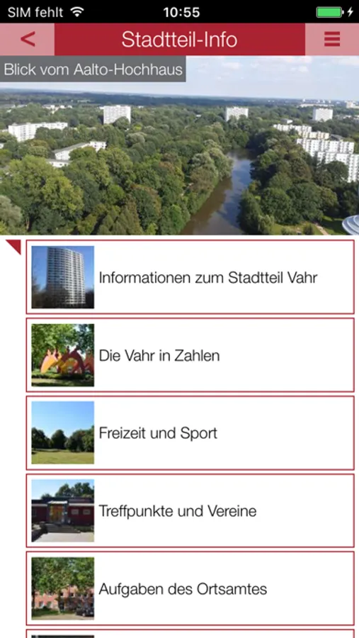 Mit der App Unsere Vahr erhalten Sie wesentliche Informationen über das Ortsamt Schwachhausen/Vahr, einen übersichtlichen Behörden-Wegweiser, nützliche Hinweise zu Sehenswürdigkeiten, interessante Kultur-, Freizeit- und Sportangebote, ein regionales Branchenbuch und ein umfangreiches Ärzteverzeichnis sowie aktuelle Neuigkeiten aus der Vahr.