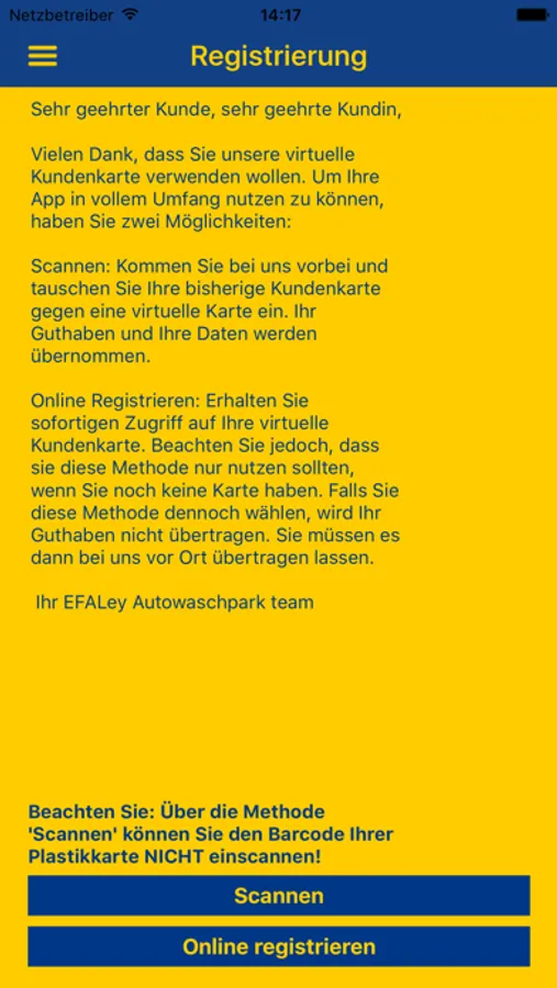 Um die App als Kundenkarte freizuschalten, melden Sie sich an unserer Kasse und scannen Sie einmal einen Beleg (NICHT Ihre bisherige Plastikkarte, sofern Sie bereits über eine Karte verfügen). Und sofort können Sie Ihre Karte nutzen. Wenn Sie bereits Besitzer einer EFALey Waschkarte sind, dann bringen Sie sie mit und wir übernehmen das Guthaben direkt.