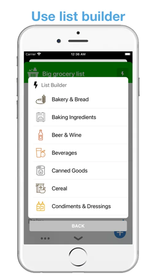 Use the grocery list builder to browse items and rapidly one-tap add each grocery item to make a list.