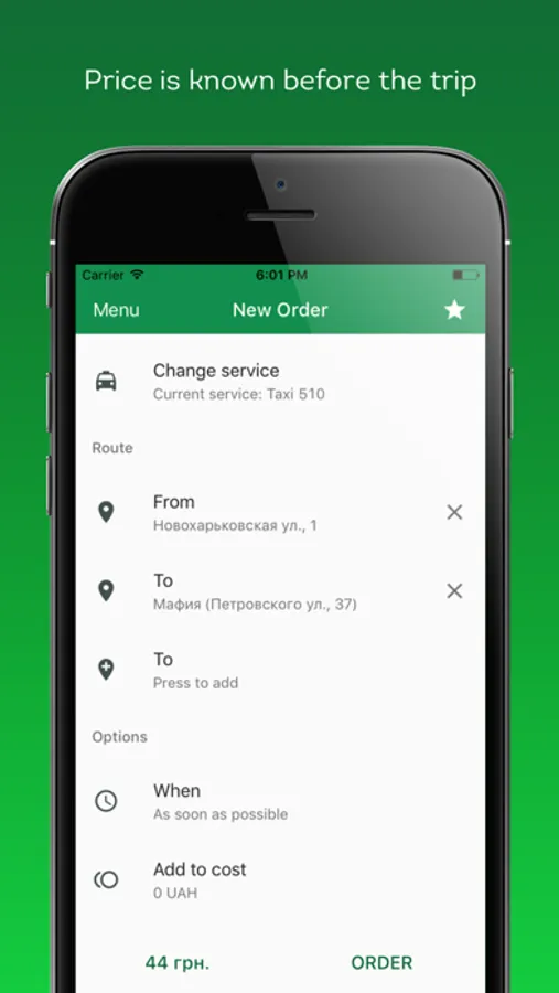 Mobile app "Taxi Kharkov" is created for quick order taxi online with your smartphone in Kharkov and suburb. It is possible to order from our app, after calculating the price of trips of different companies, which are our partners. The price does not change in the event of overlapping streets due to road conditions, or holidays.