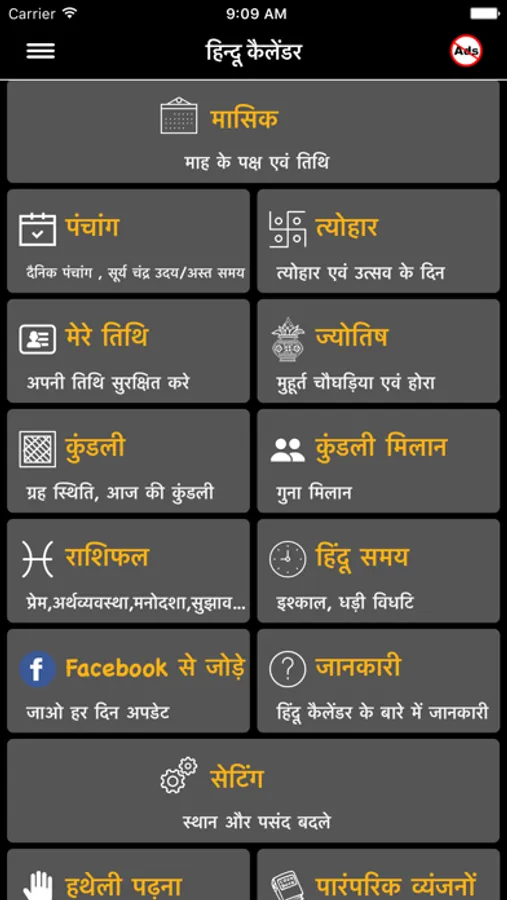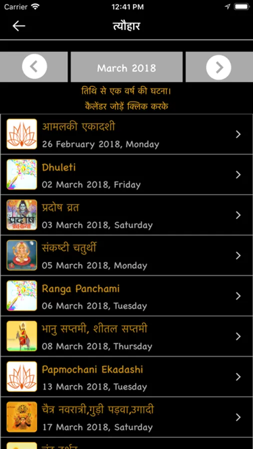 • A monthly Calendar view highlighting the Ekadashi, Chathurthi, Poornima and Amavasya. Shows the monthly list of festival. Also showing the moon phase for each date.