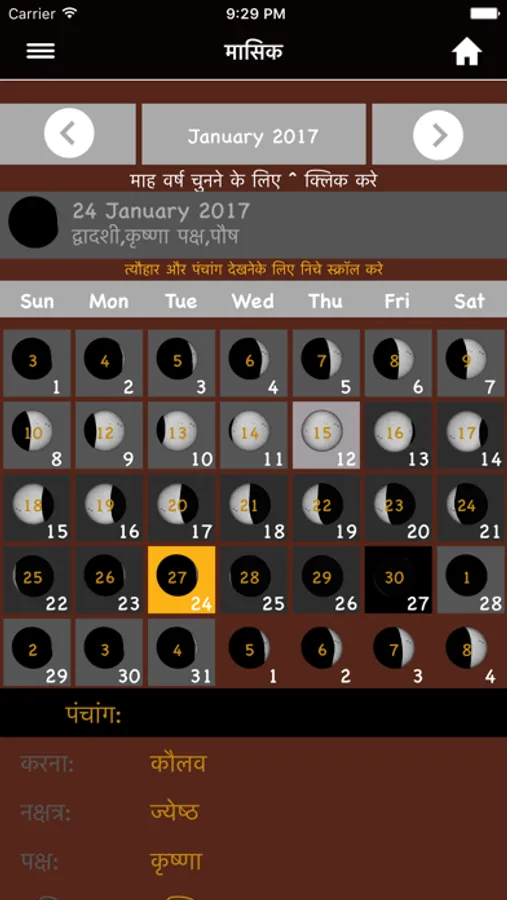 • Panchang for any day of the calendar. Tithi, paksha (shukla and krishna), yoga, karana, nakshatra and vaar.