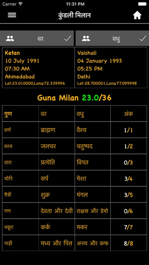 • Vimshottari Dasha for the kundali along with the rashi, lagna rashi, Varna, Nadi, Yoni, Gana and Balance of Dasha.
