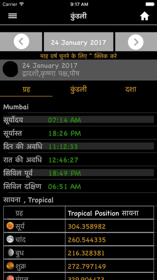 • Also shows varsh (Year), maah (month purnimant and amavasyant), zodiac of moon, ayana (Dakshinayan and Uttarayan) and the ritu (Season), along with their end times.