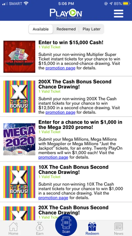 By downloading the PlayOn mobile app, you have the ability to scan your tickets quickly to earn points and then choose the drawings or rewards you wish to use them for. From games that earn you points, to second chance drawings for exclusive prizes, and rewards like coupons or tickets to events such as concerts and car races, you have so many ways to play and win! Plus, it’s never been easier to stay up-to-date on new games and promotions, or to find a Lottery retailer anywhere in Kansas. In addition, you are now able to check your tickets for winners at your convenience.