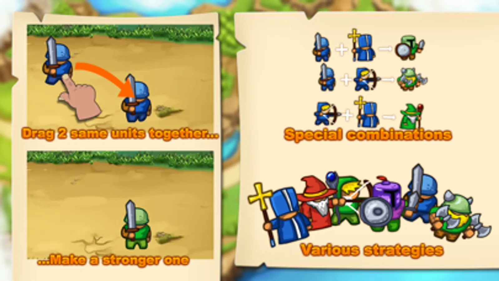 From the basic units Sword Man the Melee Warrior, Archer the Ranged Warrior, Priest the Healer, you can combine them to create Axe Man, Tank, Mage.
