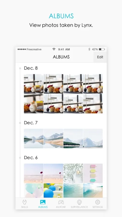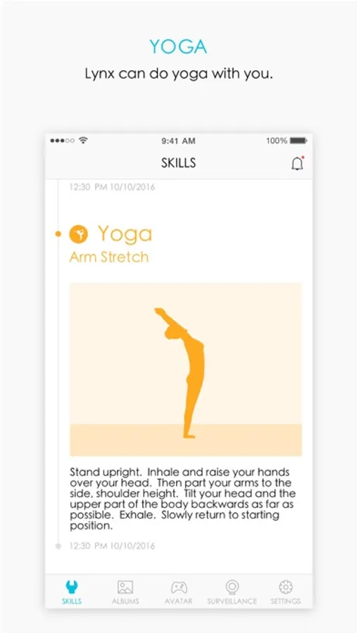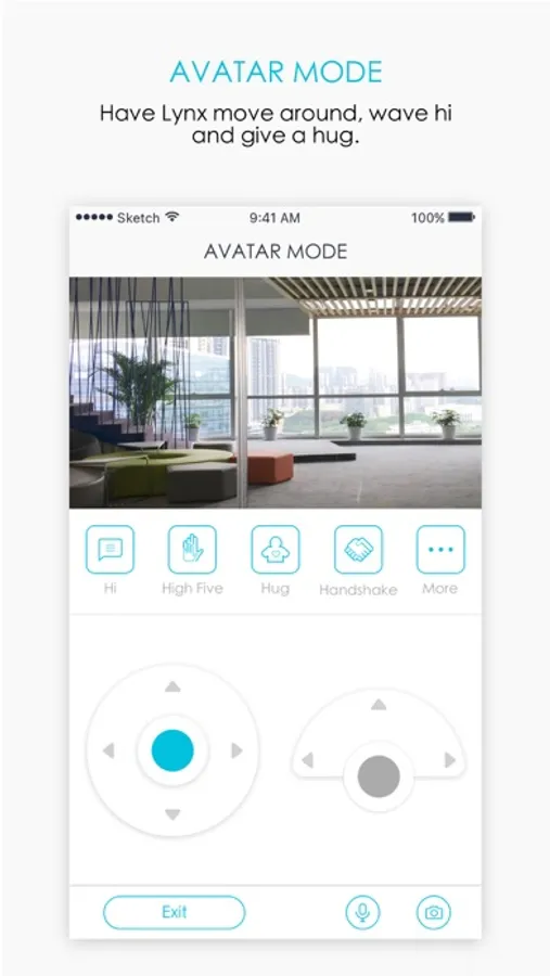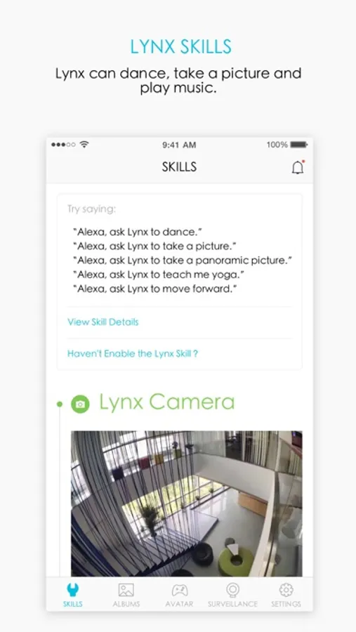 Control Lynx with Amazon Alexa with the Lynx App. In Avatar Mode you can access Lynx’s camera and speaker, take screenshots, have Lynx move, wave hi, give a high-five, and give a hug. You can also use the Lynx App to turn on the Surveillance Camera, which will take 30-second videos of moving objects.