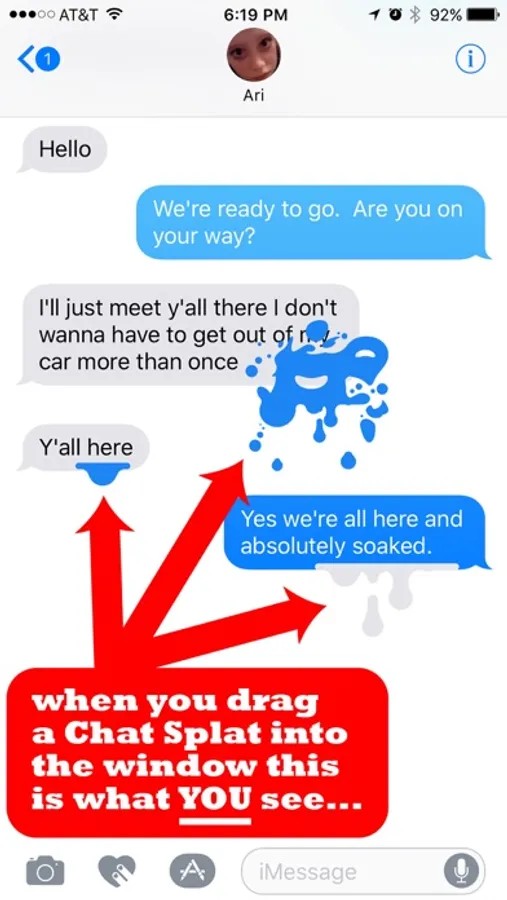 Things are about to get CRAZY sticky! This ANIMATED sticker pack adds DRIPS, DROPS, SPLATS, SPLATTERS, and so much more to your iMessages. You can have a blast with these splattery stickers that perfectly match both sent and received messages, giving chat bubbles a cool dripping effect. But the fun doesn’t stop there... we’ve included samples from our other two collections: CHAT SPLATS II: The RAINBOW, and CHAT SPLATS III: The OOZE. Both offer lots of different colors and levels of transparency and viscosity. You can even combine splats for unique looks. With the Chat Splats sticker set, your iMessages will make a real splash!