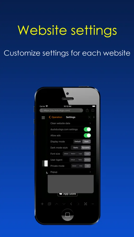 - Customize Private mode, Display mode, Font size, User-Agent, Popup, Allow Ads for each website individually.
