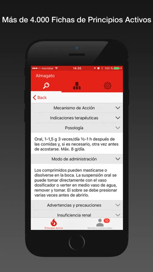 - Una vez seleccionado el medicamento se pueden consultar los diversos apartados (Indicaciones, Posología, Insuficiencias, etc.) de la ficha del principio activo y sus presentaciones comerciales.