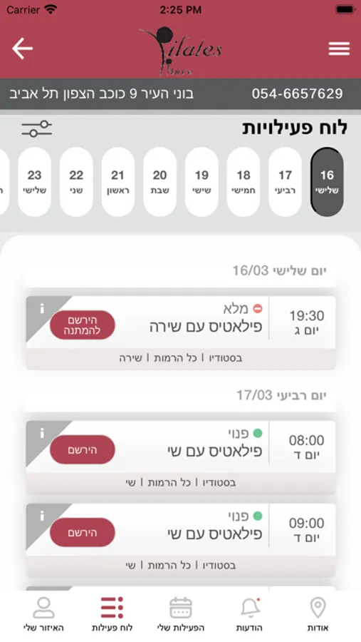 אפליקצייה המאפשרת לך להירשם ולהימחק בשיעורים און-ליין ולקבל התראה כאשר מתפנה מקום בשיעור שנרשמת אליו לרשימת ההמתנה. האפליקציה קלה לשימוש, רק צריך להירשם בפעם הראשונה עם שם המשתמש והסיסמה!