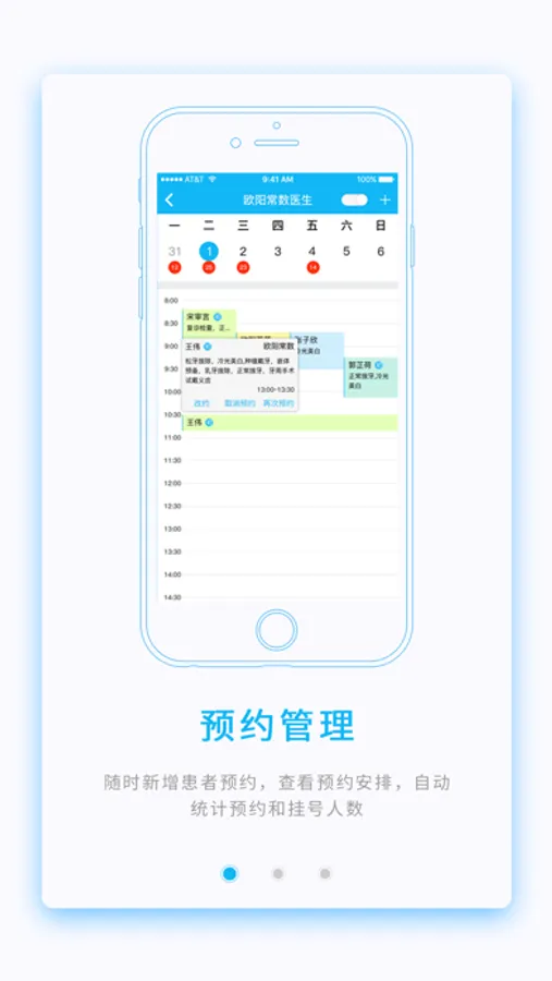 [排班月历]:每天预约人数一目了然,每天预约详情,患者姓名,治疗内容直观看见。
